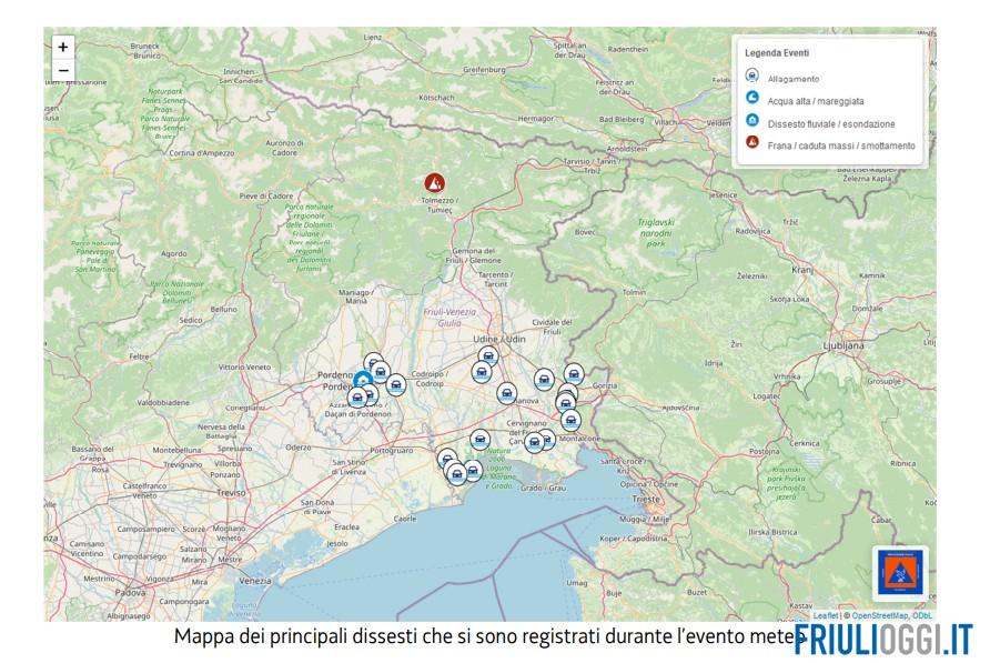La serata di mercoledì ha provocato diversi disagi: allagamenti segnalati a Trieste e a Pravisdomini (in area golenale) e caduta di alberi a Paluzza, San Pietro al Natisone e Fontanafredda. A Tolmezzo si è inoltre riattivato il movimento franoso di Cazzaso, al momento senza impatti sulla viabilità locale.