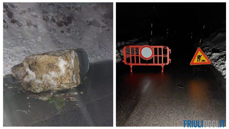 Il maltempo che sta interessando il Friuli Venezia Giulia ha causato il distacco un grosso masso. La roccia, delle dimensioni di un’automobile, si è staccato dal costone ed è precipitato sulla carreggiata della Strada Provinciale 76, al chilometro 27+100, tra le località di Cave del Predil e Sella Nevea.