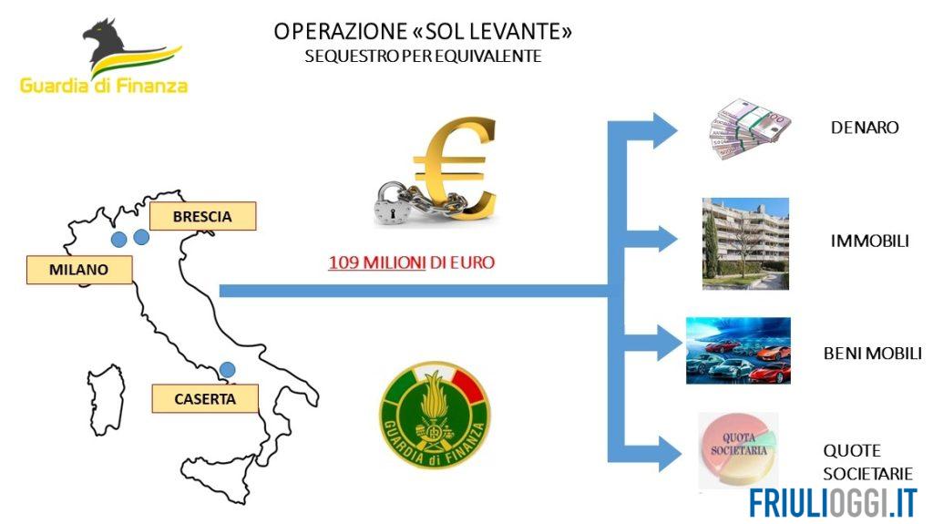 La nuova indagine, denominata “Sol Levante”, tuttora in corso, è nata da una ramificazione della precede operazione ed è stata supportata da una parallela attività amministrativa in materia fiscale svolta dall’Ufficio Antifrode dell’Agenzia delle Entrate. In quest’ultimo ambito sono in corso d’esecuzione sequestri per equivalente per complessivi 109 milioni di euro, riconducibili alle imposte evase e all’attività di riciclaggio.
