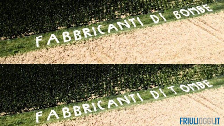 L’opera, visibile solo dall’alto, recita “Fabbricanti di Bombe – Fabbricanti di Tombe”, con una sola lettera che cambia per dare un significato preciso al messaggio. Un messaggio diretto: chi produce armi, produce morte.