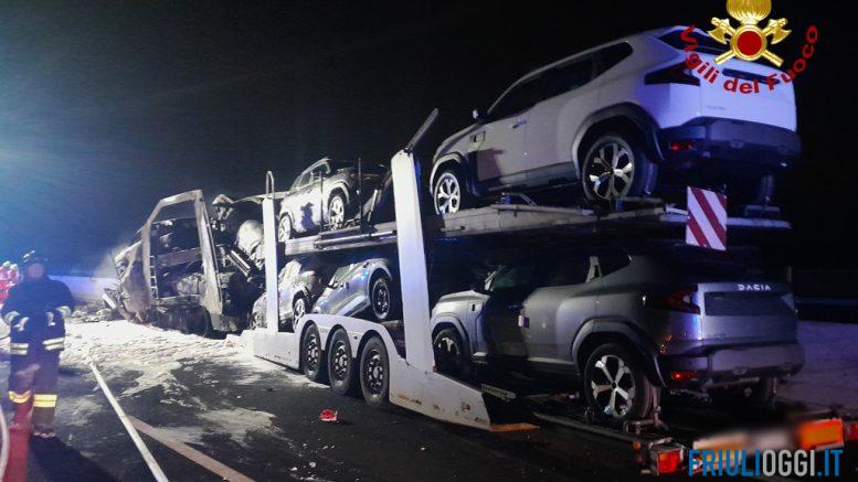Dai primi accertamenti sembra che la bisarca abbia tamponato l’autovettura e l’autoarticolato poi la bisarca e l’autovettura si sono incendiate. Una persona (occupante del veicolo leggero) è deceduta. Sul posto i vigili del fuoco del comando di Udine che stanno intervenendo con le squadre dei distaccamenti di Cervignano e Latisana supportate dalle autobotti della sede centrale del distaccamento di Lignano il funzionario di guardia e un’ulteriore squadra giunta dal distaccamento di Portogruaro.