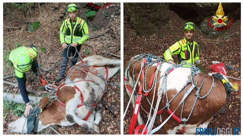 Sono servite 9 ore di lavoro alla squadra SAF ( Speleo Alpino Fluviale) del distaccamento dei Vigili del fuoco di Tolmezzo, per raggiungere e portare in salvo un bovino che a 300 metri a valle della malga Turia nel comune di Paularo, era scivolato in un dirupo rimanendovi bloccato sul fondo senza possibilità di risalire.