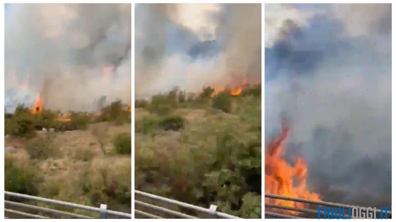 L’incendio dietro l‘area di servizio di Duino Nord.