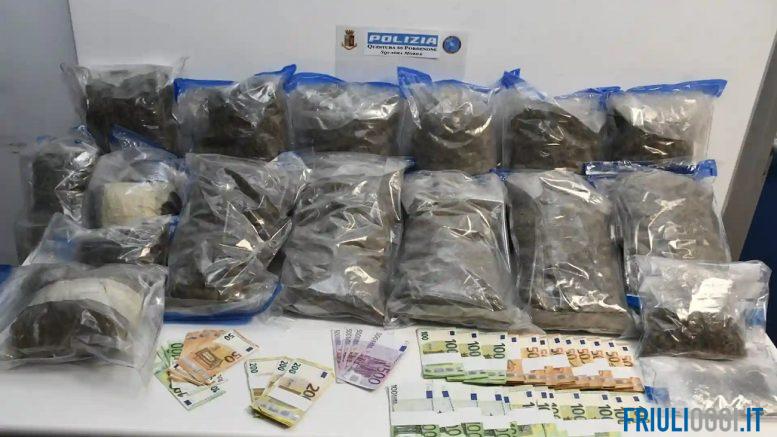 Giunti sul posto per eseguire la misura cautelare, gli agenti hanno eseguito inoltre la perquisizione disposta dall’Autorità Giudiziaria, con l’ausilio dell’unità cinofila della Polizia Locale di Pordenone, rinvenendo all’interno di un camper, parcheggiato nel piazzale dell’autofficina, 8,2chili di marijuana suddivisa in diciassette involucri, oltre a 30.000 euro in banconote di vario taglio ritenuti probabile provento dell’attività di spaccio.