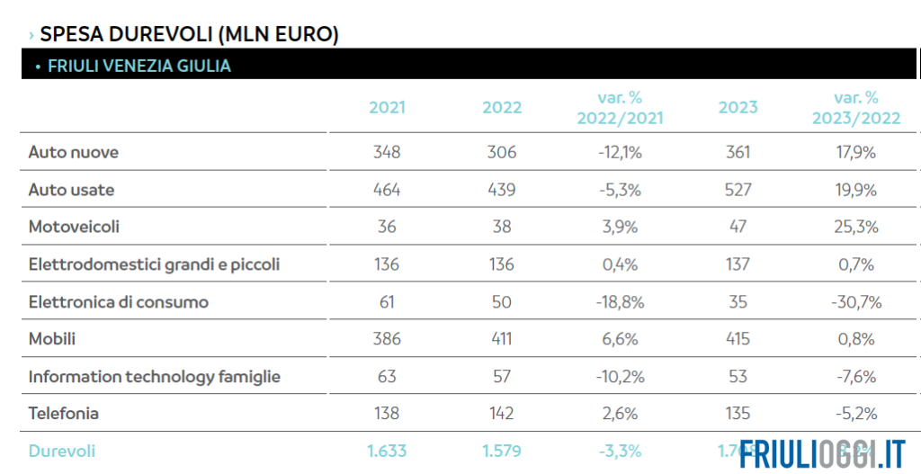 Nel 2023 in Friuli Venezia Giulia sono stati spesi 1 miliardo e 708 milioni di euro in beni durevoli: un aumento dell’8,2% rispetto al 2022, ma il dato è inferiore sia in confronto al 10% della macro-area del Nord-Est sia all’8,9% del dato medio nazionale.