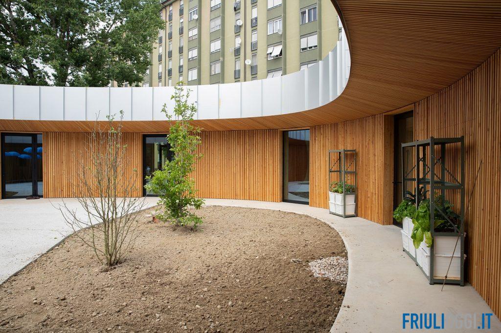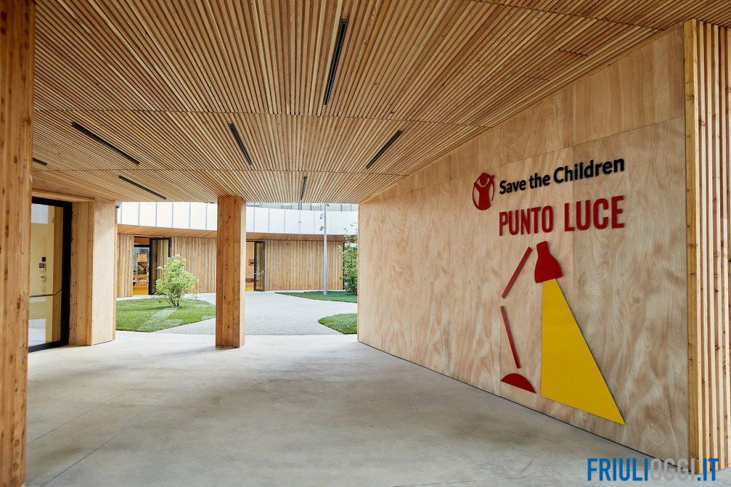 Costruita appunto interamente in legno, con materiali ecocompatibili e soluzioni energetiche efficienti, è caratterizzata da una forma circolare e spazi aperti, dinamici e versatili pensati per accogliere i minori e offrire soluzioni flessibili e creative nello svolgimento delle varie attività. L’edificio, di 650 metri quadri circa, ha un tetto verde con una copertura vegetale e pannelli solari, piante che cambiano a seconda delle stagioni e un impianto fotovoltaico capace di coprire l’intero fabbisogno del Punto Luce. La struttura racchiude un cortile interno, mentre intorno si trova un ampio giardino esterno di circa 2.000 metri quadri con alberi, camminamenti e piazzole in pavimentazione drenante.
