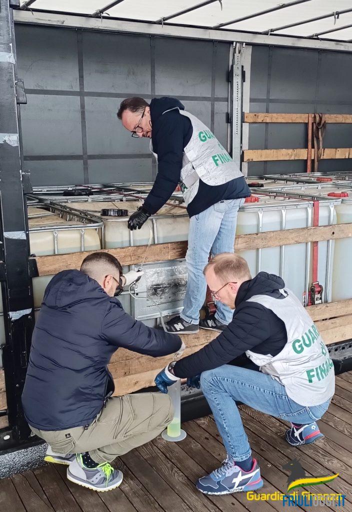 I quattro carichi illeciti sono stati inizialmente intercettati all’interno delle aree di servizio di Cormor Ovest, Zugliano Ovest e Gonars Nord dai militari del Nucleo di Polizia Economico-Finanziaria di Udine. Nell’occasione sono stati sequestrati quattro autoarticolati telonati unitamente al prodotto trasportato all’interno di 108 fusti di plastica della capienza di 1.000 litri ciascuno. Gli autotrasportatori sono stati tutti denunciati alla Procura della Repubblica di Udine per la violazione degli articoli 40 e 49 del Testo Unico delle Accise, che comporta il carcere fino a 5 anni e la multa fino a 10 volte le imposte evase.