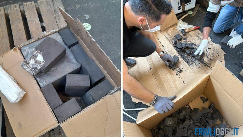 Durante l’ispezione, i finanzieri del II Gruppo di Trieste e i funzionari doganali hanno individuato dieci scatoloni sospetti. Quattro di questi contenevano mattoni e ceramiche che, una volta assemblati, avrebbero dovuto simulare un braciere ornamentale. Tuttavia, l’insolita composizione ha spinto gli operatori ad aprire i manufatti: all’interno sono stati trovati numerosi panetti di oppio. In altri sei scatoloni sono stati rinvenuti oggetti in resina, anch’essi appositamente costruiti per occultare la sostanza stupefacente.