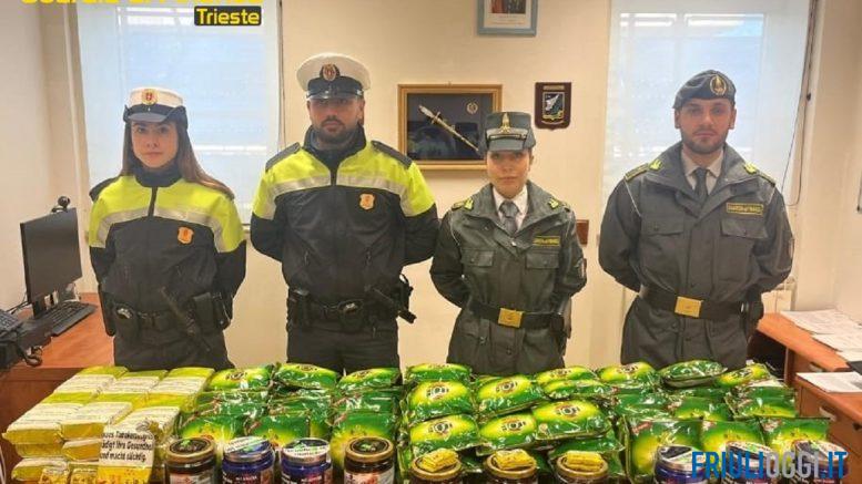 Le attività di polizia giudiziaria, coordinate dalla Procura della Repubblica di Trieste, sono proseguite con l’esecuzione delle perquisizioni domiciliari presso le abitazioni dei soggetti titolari degli esercizi commerciali dalle quali sono stati trovati altri 80 chilogrammi di tabacco da masticare di provenienza estera, privi di contrassegni e pronti ad essere illecitamente posti in vendita.