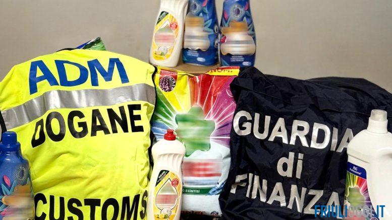 Guardia di finanza di Trieste e Agenzia delle Dogane sequestrano 4.500 flaconi contenenti detersivi e detergenti contraffatti.