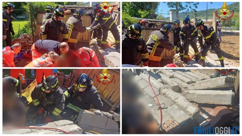 L’uomo, travolto dal crollo di un muro, è stato liberato e trasportato in ospedale.