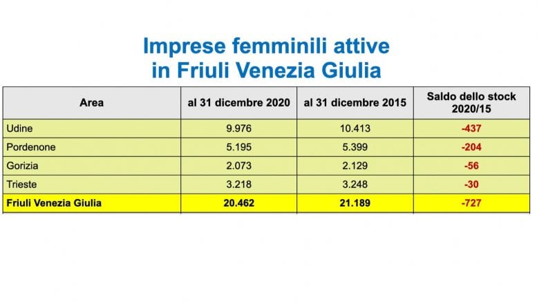 Nel 2020 sono nate 1.093 nuove imprese femminili in Friuli Venezia Giulia, 405 in meno rispetto a quelle nate nel 2019. Le imprese femminili registrate sono 22.570, il 22,3% delle 101.220 registrate nel complesso, percentuale che pone la regione leggermente (ma anche stabilmente nel tempo) sopra la media italiana, pari al 22%. Numeri che il Centro Studi della Camera di Commercio di Pordenone-Udine ha registrato appurando, nel confronto con gli anni precedenti, una generale tendenza al calo – come sta avvenendo in generale per tutte le imprese –, ma acuitasi in modo significativo proprio nel 2020, con l’unica eccezione di Trieste, che mantiene i numeri più costanti e spesso registra segni più. Se in Fvg il calo dal 2015 a oggi era sempre piuttosto contenuto, tra il 2019 e il 2020 la regione ha perso addirittura 339 imprese femminili, un calo riscontrato anche in generale nel Nordest e in Italia. E un calo che ha riguardato le imprese femminili in modo più forte: se le imprese in generale sono calate dello 0,6%, prendendo la sola componente femminile il calo è dell’1,5%, segno che l’emergenza ha pesato soprattutto sull’attività imprenditoriale delle donne.