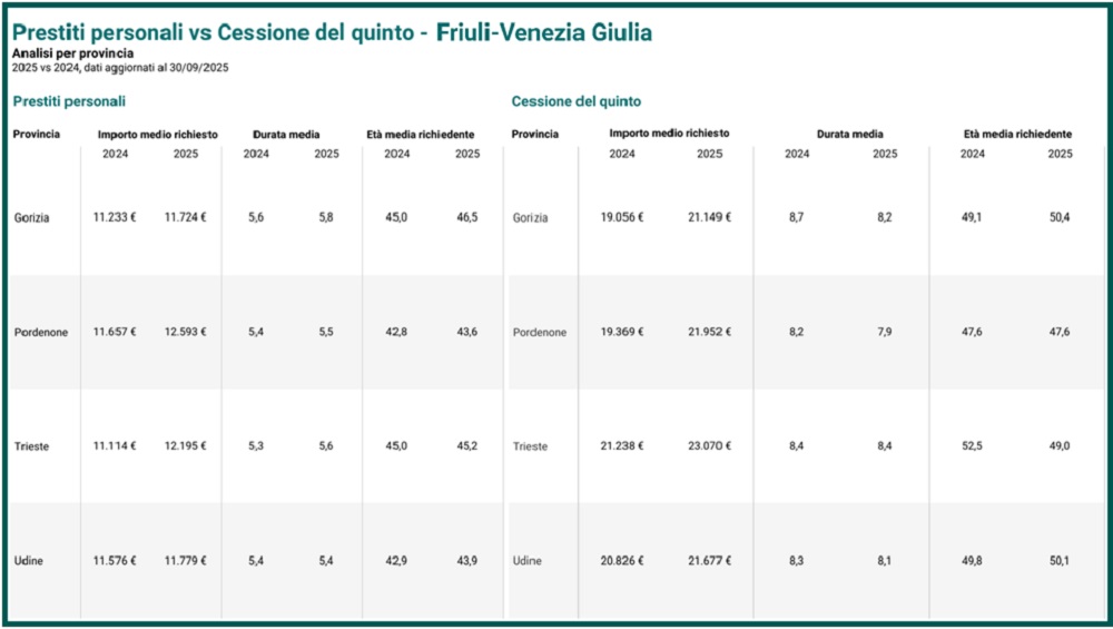 La provincia di Trieste si distingue per l’importo medio richiesto più elevato della regione per le cessioni del quinto, da 21.238 € nel 2024 a 23.070 € nel 2025, e per la durata dei finanziamenti più lunga con un dato di 8 anni e 5 mesi. Per quanto riguarda l’età dei richiedenti, nella provincia di Gorizia si registra il valore più alto, con 50 anni e 5 mesi in media, in aumento rispetto al 2024 quando era pari a 49 anni e 2 mesi.