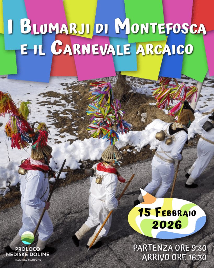 Tra i carnevali arcaici, quello di Montefosca di Pulfero è senza dubbio tra i più suggestivi e autentici. Domenica 15 febbraio 2026 torna l’appuntamento con “I Blumari di Montefosca e il Carnevale arcaico”, evento che ogni anno richiama visitatori nell’alta Val Natisone per assistere a un rito propiziatorio di grande fascino.