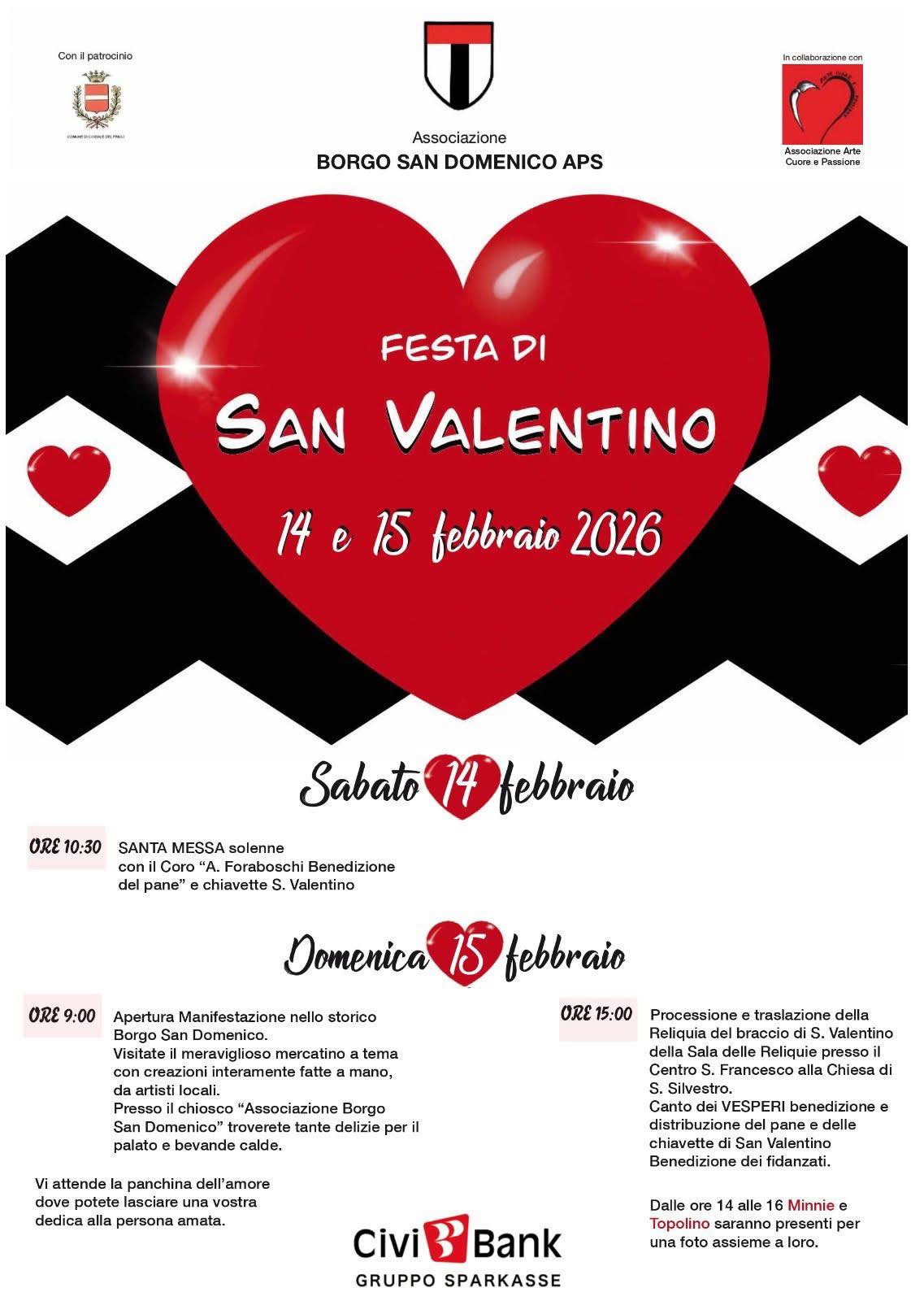 Torna anche quest’anno a Cividale del Friuli l’appuntamento con la Festa di San Valentino proposta dall’Associazione Borgo San Domenico APS. Le giornate di sabato 14 e domenica 15 febbraio 2026 animeranno lo storico borgo con un programma che intreccia celebrazioni religiose, mercatino a tema e momenti dedicati alle famiglie.