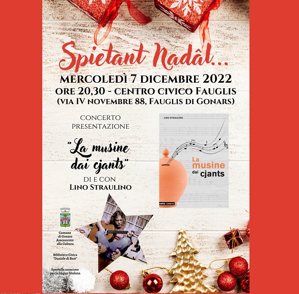 Per iniziare bene il mese di dicembre, in attesa del Natale, a Gonars si iniziano a raccogliere emozioni e sentimenti per “La musine dai cjants” (il salvadanaio dei canti), in un concerto/presentazione dell’ultimo lavoro di Lino Straulino, recentemente pubblicato da Nota, che si terrà il 7 dicembre, alle 20.30, nel centro civico di Fauglis di Gonars, paese dove trascorse gli ultimi anni di vita Tite Grison (Giovanni Battista Marzuttini), a cui lo stesso Straulino ha dedicato diversi studi.