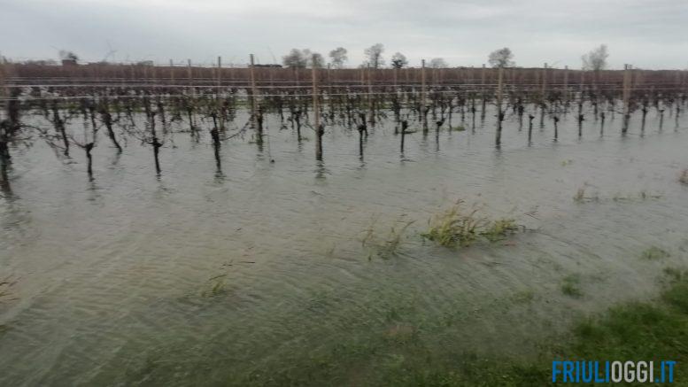 A cause dell’alta marea e delle precipitazioni, nella mattinata di oggi, in località Palazzatto, nel territorio comunale di Fiumicello Villa Vicentina, le acque del canale Tiel sono esondate superando un argine e andando ad allagare le campagne circostanti condotte a colture.