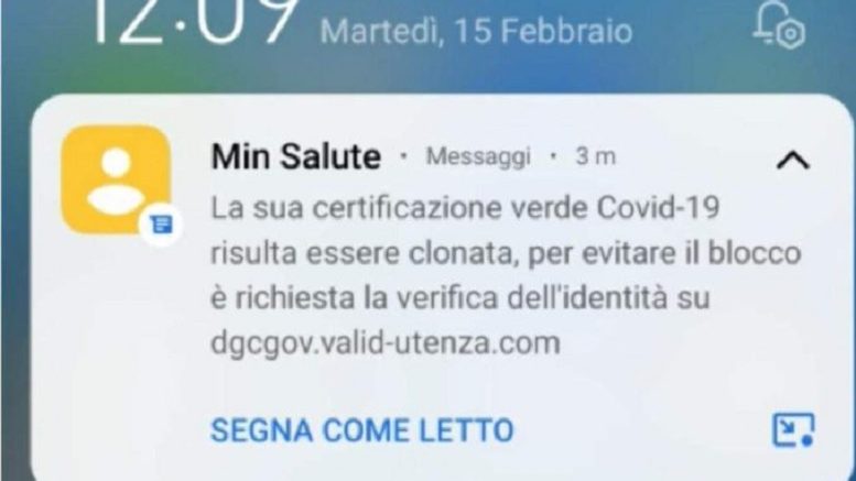 “La sua certificazione verde Covid-19 risulta clonata – si legge nel testo del messaggio -, per evitare il blocco è richiesta la verifica dell’identità su…”, con susseguente link sul quale cliccare. Ma non fatelo, è pericoloso.