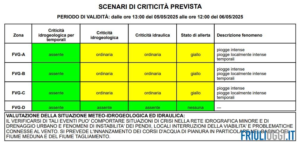 L’ondata di maltempo continua a colpire il Friuli Venezia Giulia e la Protezione Civile ha diramato una nuova allerta meteo gialla, dalle 13 di lunedì 5 maggio, fino alle 12 di martedì 6 maggio, per la possibilità di piogge intense (localmente molto intense) e temporali. La situazione attuale vede una depressione interessare l’Italia settentrionale, facendo affluire sulla regione correnti mediterranee molto umide e instabili. Da martedì il flusso meridionale tenderà a ridursi ma permarrà l’instabilità.