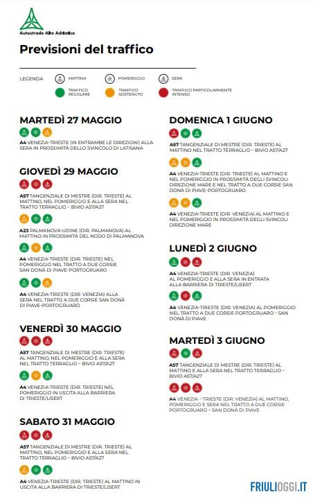 E’ invece previsto per il 29 maggio, (giorno dell’Ascensione in Austria) il primo bollino rosso (traffico particolarmente intenso) sulla A57 Tangenziale di Mestre per la tutta la giornata, mentre i transiti saranno sostenuti fin dal mattino sulla A23 (Udine Sud – Palmanova) e nel tratto a due corsie nel pomeriggio e alla sera nel tratto a due corsie della A4 tra San Donà di Piave e Portogruaro in entrambe le direzioni.