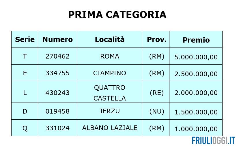 Su 306 biglietti vincenti totali, l’estrazione dei primi cinque premi si è svolta in diretta dal Teatro delle Vittorie di Roma, nel corso di Affari Tuoi, il programma di Rai Uno condotto da Stefano De Martino, appuntamento che accompagna tradizionalmente la fase conclusiva della lotteria nazionale. Ecco i numeri vincenti dei premi più alti: