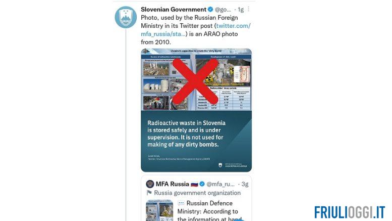 A rivendicare la paternità dell’immagine è stato lo stesso Governo di Lubiana, dopo che il ministero degli Esteri russo aveva pubblicato un’immagine con un avvertimento che l’Ucraina si starebbe preparando a usare una “bomba sporca”.