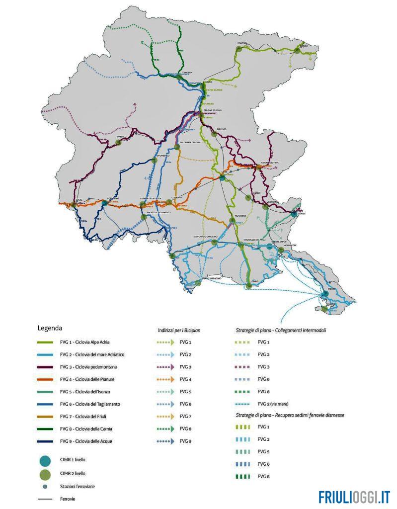 Come evidenziato dall’esponente della Giunta uno dei punti di forza del Piano regionale della mobilità ciclistica è la capacità di collegare alcuni assi europei alle località più piccole, implementando grazie all’integrazione con la rete del trasporto pubblico locale, un sistema basato sull’intermodalità. In questo modo si promuove, in un’ottica green, la mobilità ciclabile anche come mezzo di trasporto per raggiungere gli istituti scolastici e i luoghi di lavoro: un percorso sviluppato grazie al coinvolgimento nella definizione del Premoci, oltre che dei Comuni, anche delle imprese, che hanno avuto modo di segnalare le esigenze dei propri dipendenti. Quattro delle nove ciclovie previste in Friuli Venezia Giulia, ovvero l’Alpe Adria, la pedemontana, quella del Tagliamento e quella della Carnia contemplano collegamenti intermodali terresti, mentre quella del mare Adriatico prevede anche l’integrazione con mezzi di trasporto via mare, collegando cose le località costiere della regione.