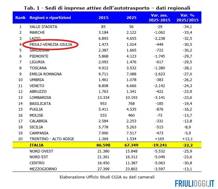In Friuli Venezia Giulia il settore dell’autotrasporto è già in forte ritirata e ora rischia un ulteriore colpo. Negli ultimi dieci anni ha perso il 30,5% delle imprese attive, uno dei cali più pesanti a livello nazionale. Un dato che fotografa una crisi strutturale e che oggi rischia di aggravarsi ulteriormente sotto la pressione del caro-carburante.