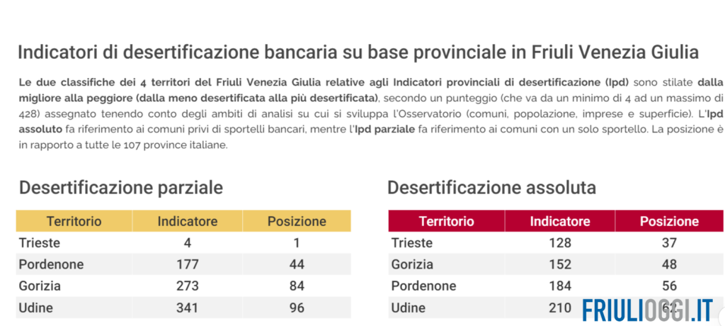 E se si pensa che il fenomeno colpisca solo i piccoli Comuni montani, è un errore: nell’elenco di quelli privi di banche, ci sono ad esempio anche Magnano in Riviera e Cassacco mentre in quelli che ne hanno solo uno troviamo Pagnacco, Pradamano e Sesto al Reghena, solo per citarne alcuni.