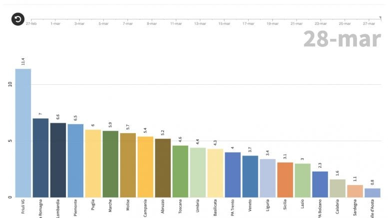 Dati che al momento non sono incoraggiati per il Friuli Venezia Giulia. Al 28 marzo la regione detiene ancora il record italiano di decessi per 100mila abitanti sui 30 giorni e nel periodo 20-21 è seconda solo alla Lombardia. “Se chi sta alla guida non ha il polso fermo e teme di perdere voti, in questa fase terribile, fa danno – ha commentato il segretario del Pd provinciale di Udine Roberto Pascolat -. Basta con questa narrazione dei migliori della classe fuorviante e pericolosa, anche sulle riaperture”.