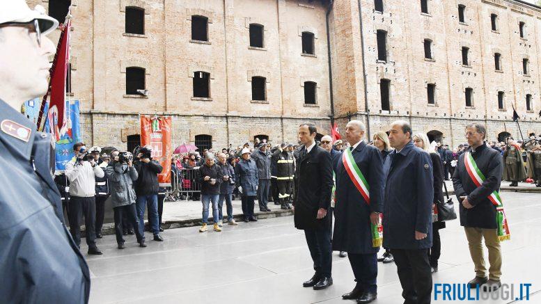Nel corso della cerimonia Fedriga ha deposto una corona d’alloro per la Regione, assieme a quella del prefetto di Trieste Pietro Signoriello e a quella del sindaco di Trieste Roberto Dipiazza, alla presenza dei rappresentanti e i labari di vari gruppi, enti, associazioni dei Volontari della Libertà, dei Caduti, delle Associazioni combattentistiche e d’Arma, dei sindacati, del Comitato internazionale del Lager nazista della Risiera di San Sabba, oltre alla bandiera della Brigata Ebraica.