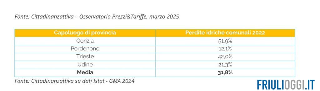 Uno dei dati più preoccupanti riguarda la dispersione idrica: a livello nazionale, in base ai dati Istat, nel 2022 si è perso il 42,4% dell’acqua immessa in rete. In Friuli Venezia Giulia, la media regionale è del 31,8%, ma con forti differenze tra le città: Gorizia, ad esempio, registra la dispersione più alta, con il 51,9% dell’acqua che si perde lungo la rete.