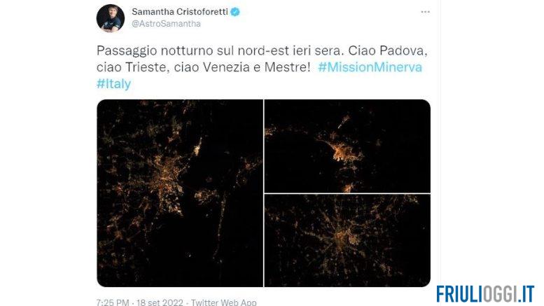 Ai social, Samantha Cristoforetti ha anche affidato il suo saluto: “Passaggio notturno sul nord-est ieri sera. Ciao Padova, ciao Trieste, ciao Venezia e Mestre!”.