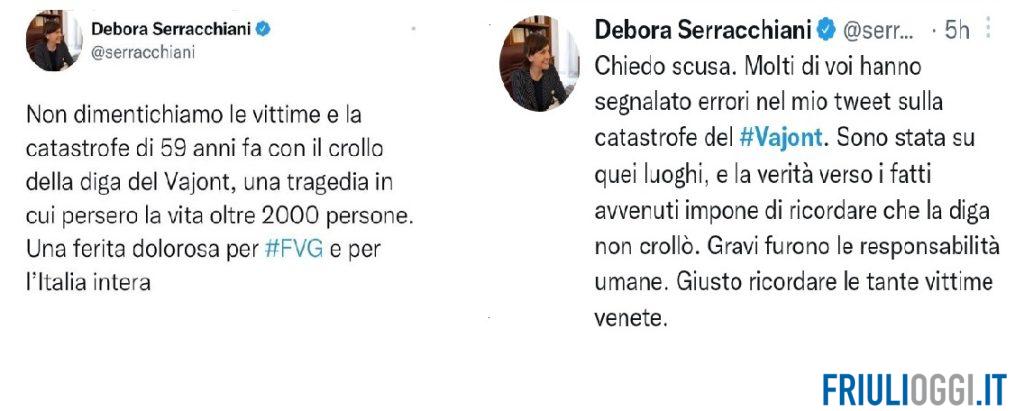 Anche l’ex presidente del Fvg, Debora Serracchiani, ieri ha voluto ricordare la tragedia del Vajont. Lo ha fatto con un tweet finito poi al centro della bufera: “Non dimentichiamo le vittime della catastrofe di 59 anni fa con il crollo della diga del Vajont, una tragedia in cui persero la vita oltre 2000 persone. Una ferita dolorosa per il Fvg e per l’Italia intera”.