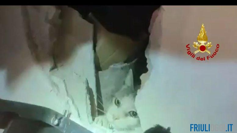 Giunti sul posto i vigili del fuoco sono stati informati che nel frattempo il felino era caduto nel camino ed era intrappolato sul fondo della canna fumaria. I pompieri hanno calato una corda nel camino per prendere la misura della canna fumaria al fine di bucare il camino per raggiungere il gatto. Successivamente hanno provveduto a forare il muro in corrispondenza della canna fumaria riuscendo a liberare il micio.