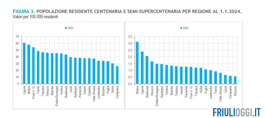 A certificarlo sono i dati Istat: al 1° gennaio 2024, l’Italia conta 22.552 centenari, con una crescita del 30% rispetto a dieci anni fa. Il Friuli Venezia Giulia si distingue in questo contesto per l’elevata concentrazione di persone che hanno raggiunto il secolo di vita: 54 ogni 100mila abitanti, uno dei dati più alti a livello nazionale, superato solo da Liguria (61 ogni 100mila) e Molise (58).