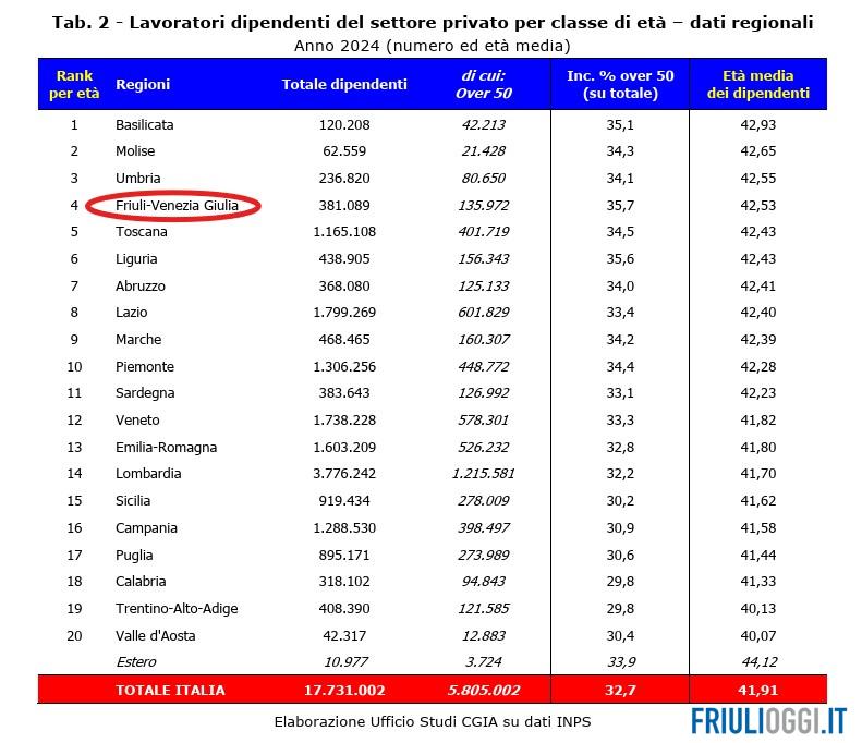 Il lavoro in Friuli Venezia Giulia invecchia più velocemente che nel resto d’Italia: nel 2024 la regione registra infatti la più alta incidenza nazionale di lavoratori dipendenti over 50, pari al 35,7% del totale, un dato che colloca il Friuli Venezia Giulia al primo posto in Italia per anzianità della forza lavoro. È quanto emerge dall’ultimo studio dell’Ufficio Studi della Cgia di Mestre, basato sui dati Inps relativi al settore privato non agricolo