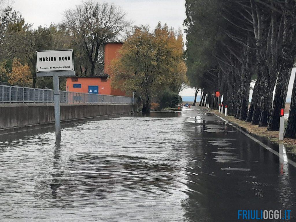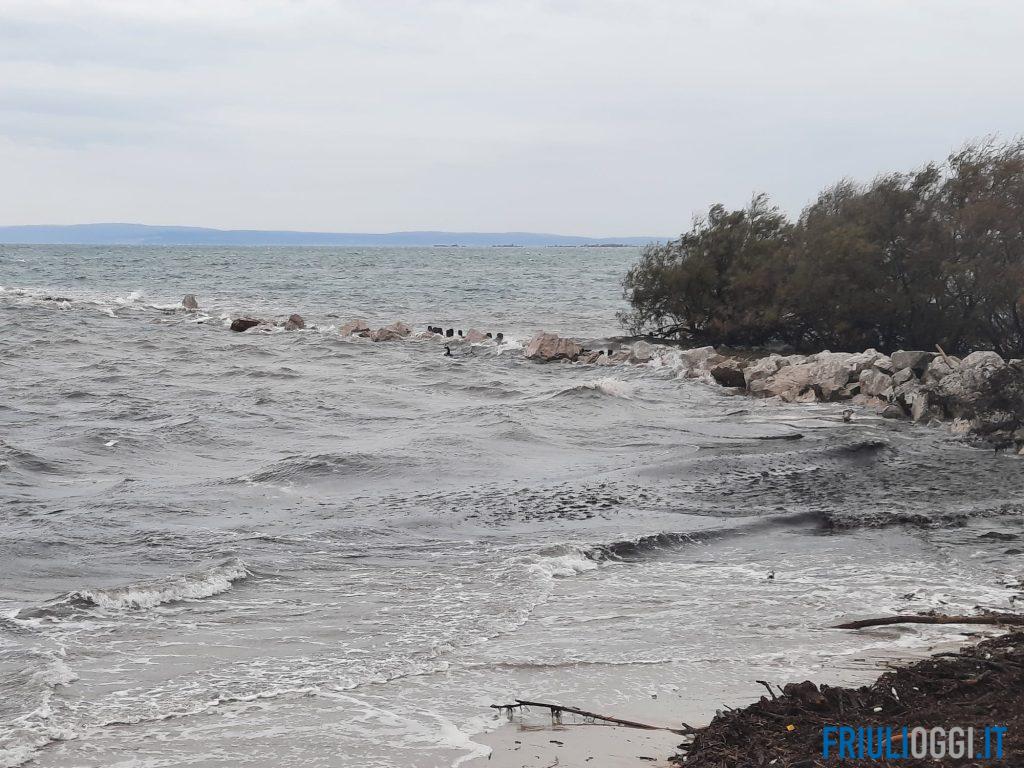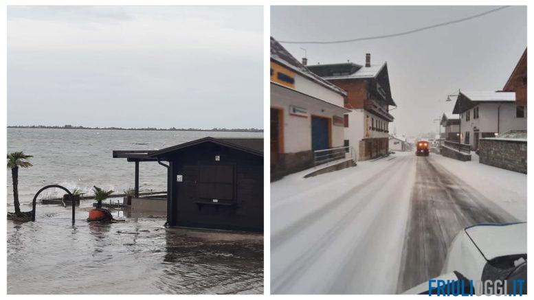 L’ondata di maltempo, come da previsioni, ha colpito il Fvg, con alta marea e allagamenti sulle coste e nevicate in montagna.