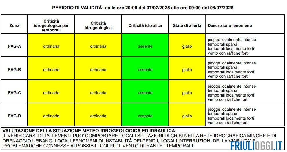 Mentre sono in conclusione gli interventi dei vigili del fuoco per il maltempo che, soprattutto nella notte tra il 6 e il 7 luglio, si è abbattuto sul Friuli, la Sala Operativa della Protezione Civile regionale ha emesso una nuova allerta meteo. Si tratta di un’allerta gialla valida su tutte le aree del Fvg dalle 20 di oggi, 7 luglio, alle 9 di domani, 8 luglio, per temporali che potranno essere localmente anche forti con raffiche di vento sostenuto.
