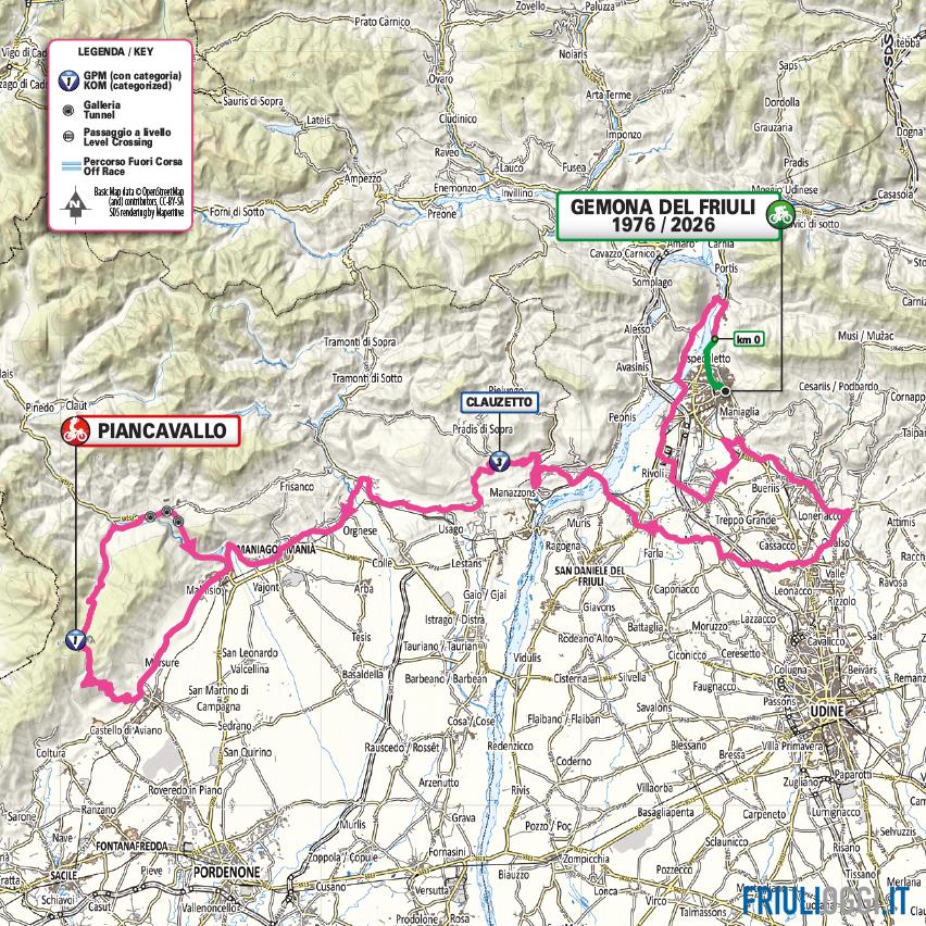 La tappa nella nostra regione sarà la ventesima, l’ultima, prima del gran finale a Roma: l’appuntamento è per sabato 30 maggio 2026 con i ciclisti che affronteranno 199 chilometri, con partenza da Gemona del Friuli, cittadina simbolo del sisma del 1976, per attraversare il cratere del terremoto del Friuli e poi scalare due volte il Piancavallo con un circuito che tocca il Lago di Barcis (l’ultima volta vinse Pantani, nel 1998 prima di conquistare quel Giro).
