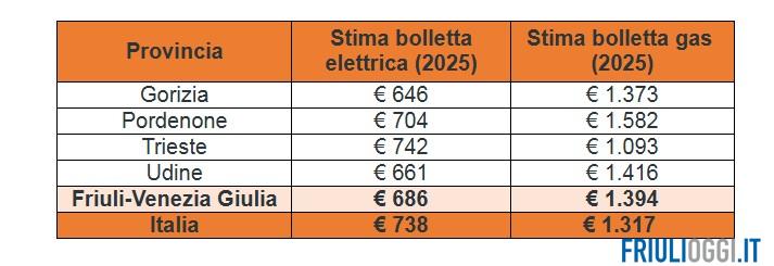 Nello specifico, nel 2025, a pesare maggiormente sulle tasche dei residenti del Friuli-Venezia Giulia è stata la bolletta del gas che, in media, è arrivata a 1.394 euro, mentre per quella elettrica gli abitanti hanno dovuto mettere a budget 686 euro.