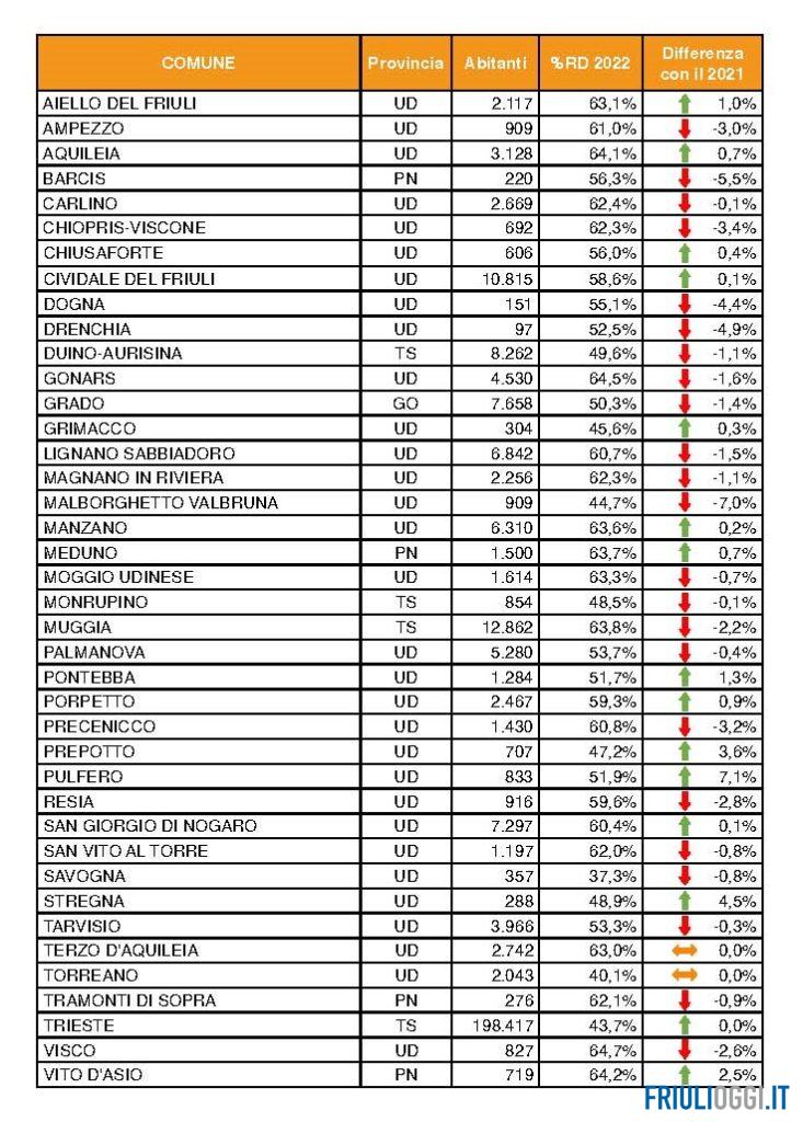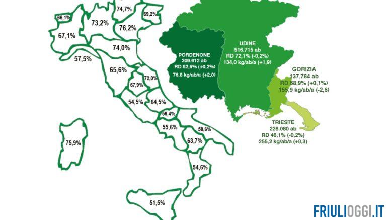 Assenti in questa classifica i comuni della provincia di Gorizia e Trieste. Forte disomogeneità si riscontrano tra i comuni delle ex Province: primeggia Pordenone con l’82% di raccolta differenziata, Udine con il 72,1%, Gorizia con il 68,9% e Trieste con il 46,1%.