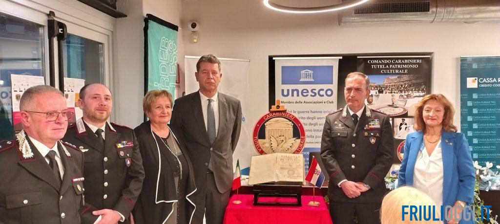 Nel dettaglio, è stato riconsegnato un prezioso volume a stampa del XVII sec. (1698), intitolato “Historia Di Trieste” di Fra Ireneo della Croce, provento di una serie di furti interconnessi e verificatisi in danno della Biblioteca Nazionale e Universitaria di Zagabria tra il 1982 e il 1985, provocando un ammanco di più di 1300 volumi antichi. La seicentina, individuata dai Carabinieri del Nucleo di Udine sull’e-commerce (nella disponibilità di un privato cittadino residente in provincia di Gorizia) è risultata corrispondente a quella trafugata in Croazia, grazie a un primo accertamento operato attraverso la “Banca Dati dei Beni culturali illecitamente sottratti”, il database ministeriale (Ministero della Cultura) più grande al mondo e che costituisce il cuore pulsante delle attività del TPC.