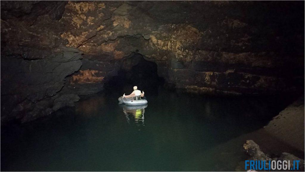 La sorpresa più grande è arrivata, però, procedendo verso valle, dove il fiume si incanala in una galleria grande come la “Sandrinelli”. Col puntatore laser, la misurazione dava almeno cinquanta metri, per poi andare fuori scala. E’ stato necessario attendere il periodo estivo con il fiume in magra per poter navigare in questa galleria in totale sicurezza. Il passaggio sembrava non finire più e i cinquanta metri previsti inizialmente si sono rivelati essere quasi cento. Per proseguire si è poi dovuto ormeggiare e sbarcare dal gommone. Davanti agli esploratori si è svelata una nuova grande galleria, larga venti, alta venti e lunga settanta metri, che termina con un profondo lago che cela nuovamente il percorso segreto del Fiume.
