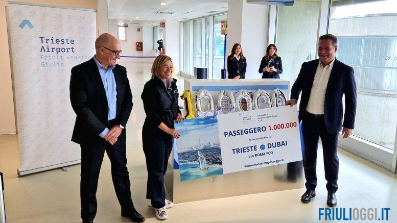 Per celebrare l’avvenimento, il presidente del Trieste Airport, ha premiato il milionesimo passeggero: la signora Susanna Serri, in partenza dall’aeroporto della regione Friuli Venezia Giulia per Roma Fiumicino, sul volo ITA Airways delle 11:15. Le sono stati consegnati a sorpresa due biglietti aerei concessi dalla compagnia aerea in collaborazione con Trieste Airport, un volo andata e ritorno per due persone Trieste – Dubai: la nuova connessione che ITA Airways propone da Trieste Airport con scalo via Roma Fiumicino.