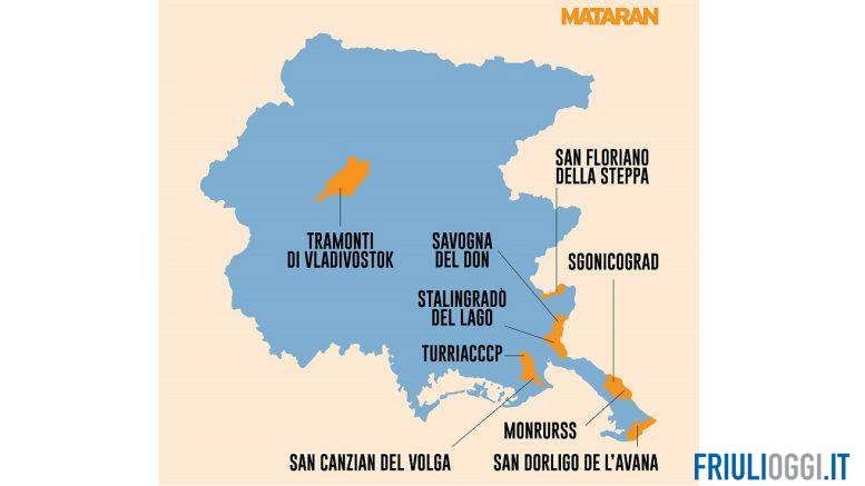 E così, Il Fvg si trasforma nell’acronimo di Fedriga Venezia Giulia, ecco comparire Tramonti di Vladivostok, San Canzian del Volga, TurriCccp; e ancora Stalingradò del Lago, MonrUrss, San Dorligo dell’Avana, San Floriano della Steppa, Sgonicograd e Savogna del Don, storpiature di reminiscenza sovietica dei piccoli centri che hanno votato “controcorrente”.