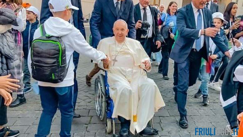 Più fortunati, invece, quelli del Bearzi che hanno intercettato Papa Francesco negli spazi esterni dell’Aula Nervi mentre, seduto in sedia a rotelle, stava rientrando nella sua residenza a Santa Maria: alcuni bambini sono quindi riusciti anche a stringergli la mano.
