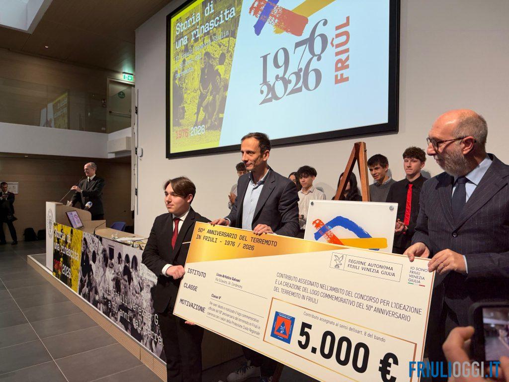 Durante la cerimonia, Fedriga ha premiato Davide Giroldo, studente della 5E del Liceo Artistico Galvani di Cordenons, vincitore del concorso per il logo commemorativo del 50° anniversario. Il logo, simbolo della memoria del sisma, della resilienza della comunità e della rinascita, accompagnerà tutte le attività della Regione nel corso del 2026.