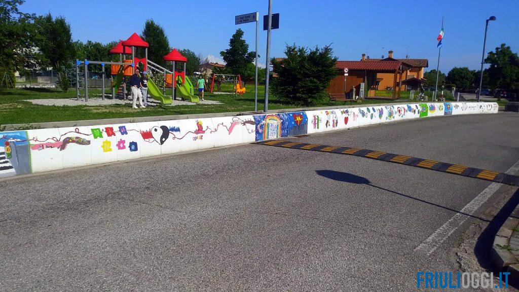 Bambini della scuola materna, studenti della scuola primaria e della secondaria di primo grado, in tutto oltre un centinaio, le famiglie, gli insegnanti, educatori e volontari si sono ritrovati uniti nella prosecuzione dell’opera artistica nell’area scolastica e sportiva, dando seguito al grande murale avviato durante lo scorso anno scolastico in via Rizzolo, precisamente lungo le pareti esterne delle fioriere cementificate che costeggiano la pista ciclopedonale.