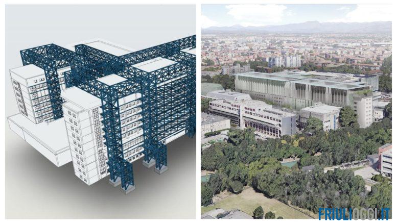 L’opera, progettata per il retrofit sismico delle strutture esistenti a bassa capacità dissipativa, sarà capace di incrementare significativamente le performance di resistenza e rigidezza in caso di terremoto. Il progetto di Cimolai SpA si caratterizza anche per il sistema di montaggio che prevede l’utilizzo di una gru a torre installata sul tetto dell’ospedale.